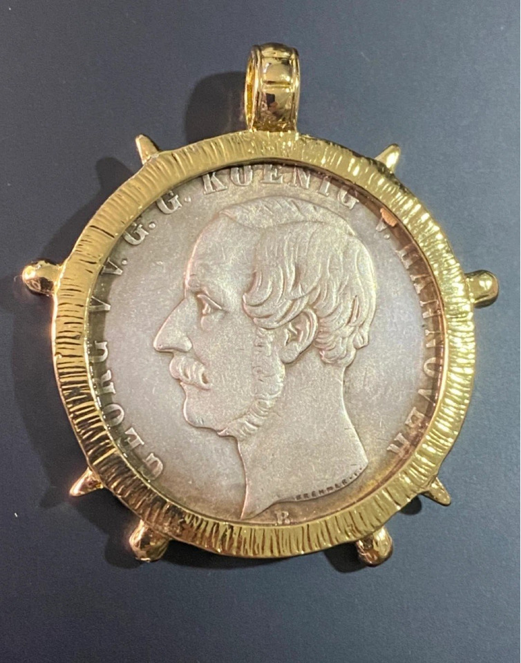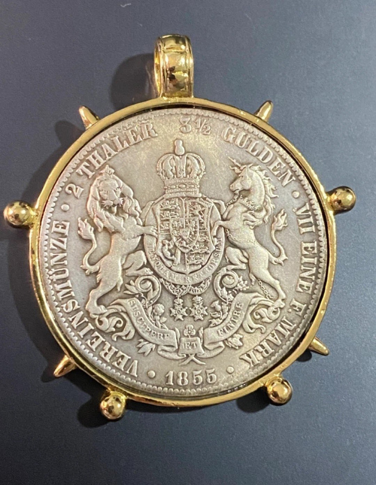 This is a silver 2 Thaler Gulden coin from 1855, set in a gold-plated pendant. The coin features a crest with two lions and a crown on one side, and a portrait of Georg V on the other. It's a unique piece for collectors. Silver Breakdown