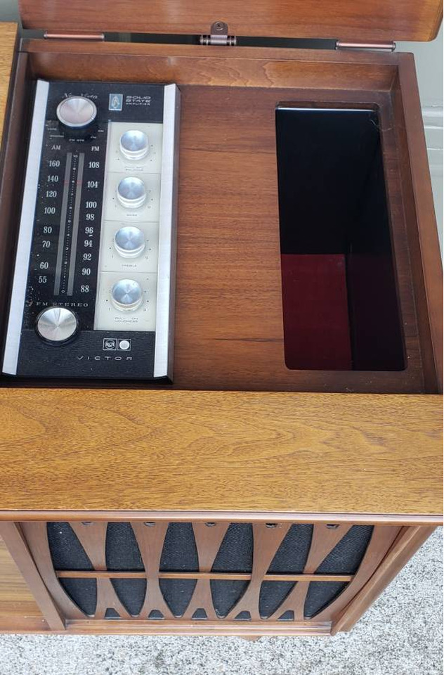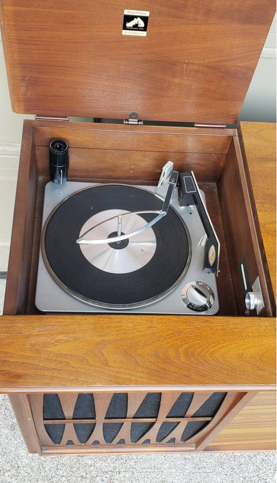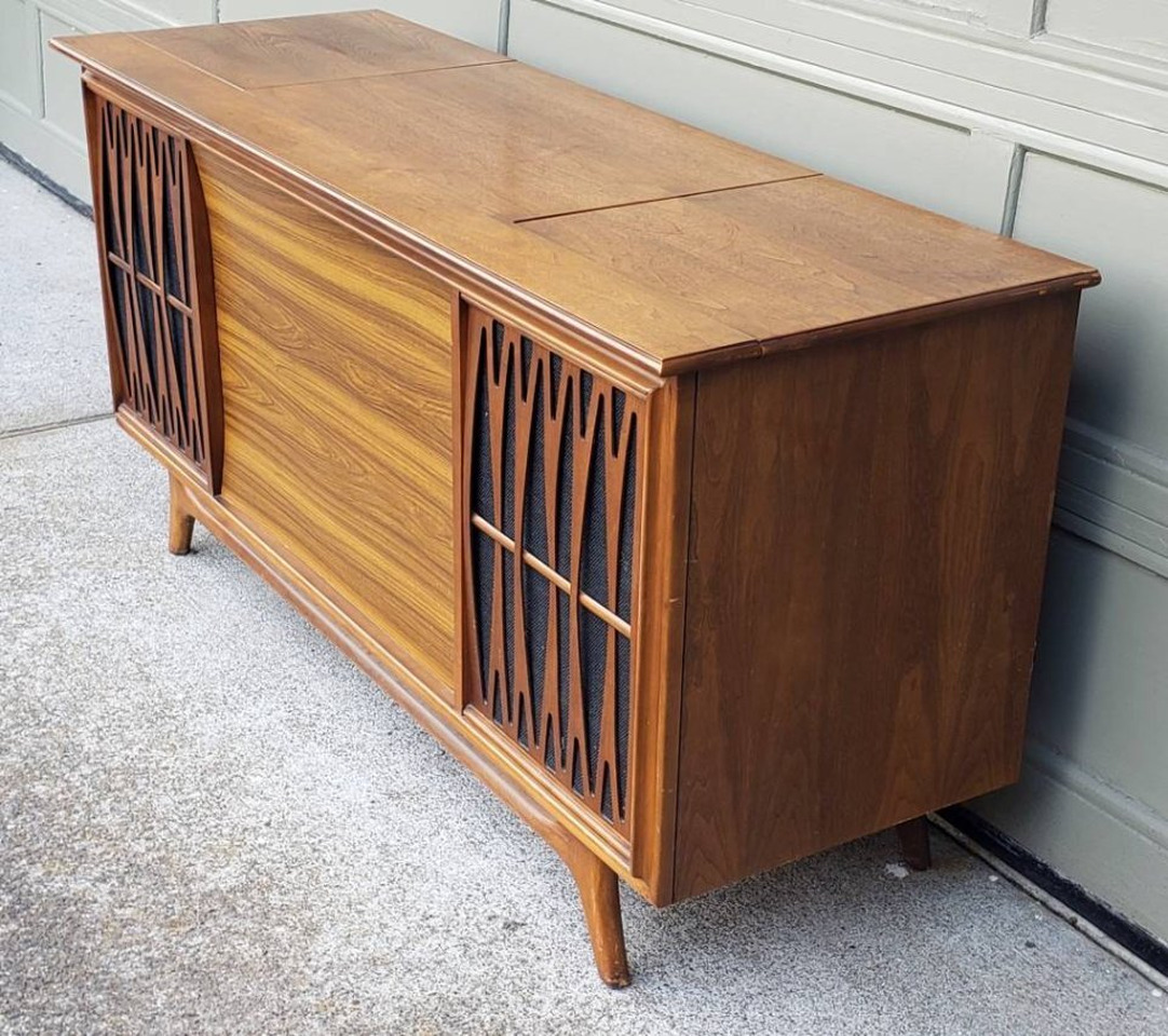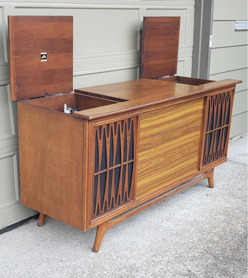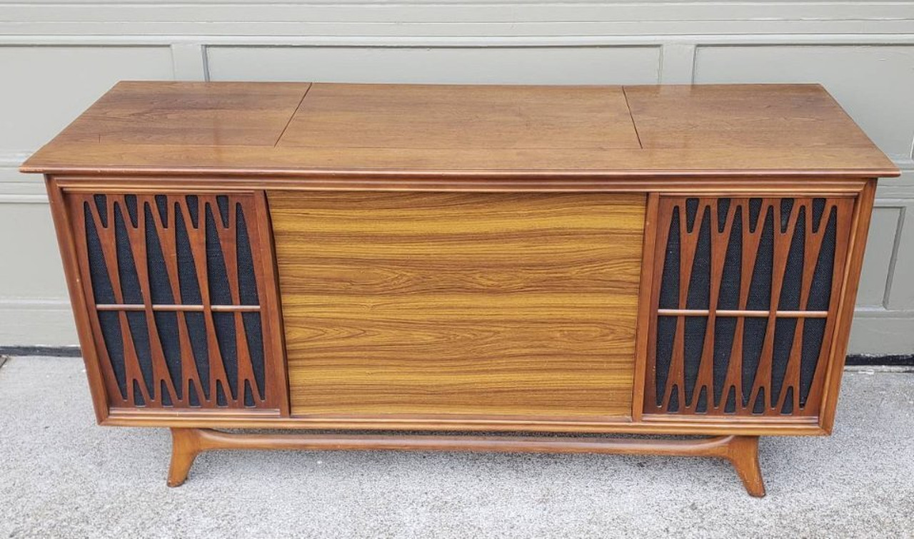 Step back in time. Rare vintage modern stereo console. Has the AM/FM stereo tunner.. and fully operational turntable / record player. Beautifully designed cabinet creates an awesome mid century focal point wherever you need it. Operates with tubes, and seemingly comes alive with lights, sound and warmth :) There are speakers at each end for true vintage stereo sound. Beautiful modern style walnut cabinet. Pretty cool! come check it out. (๐03)7๐0-348๐