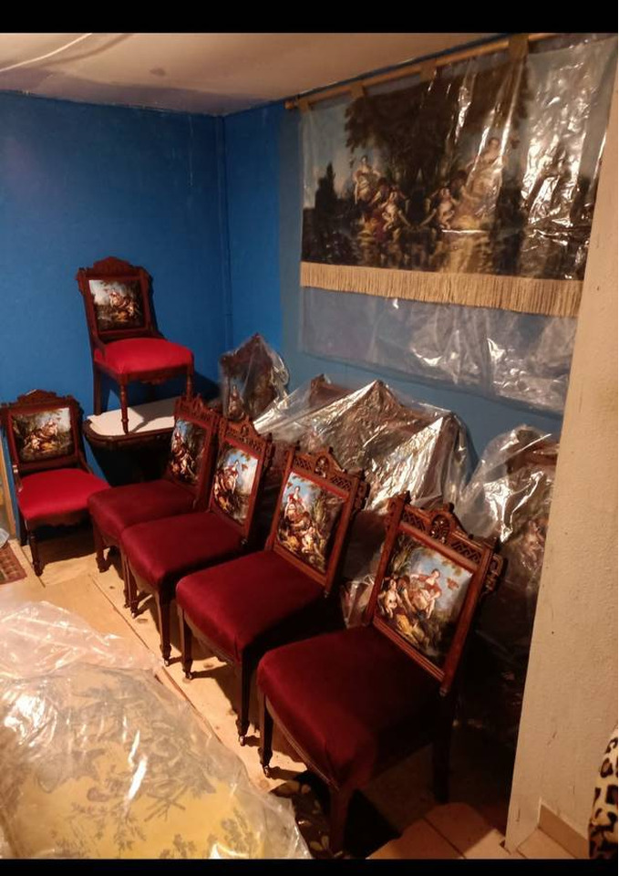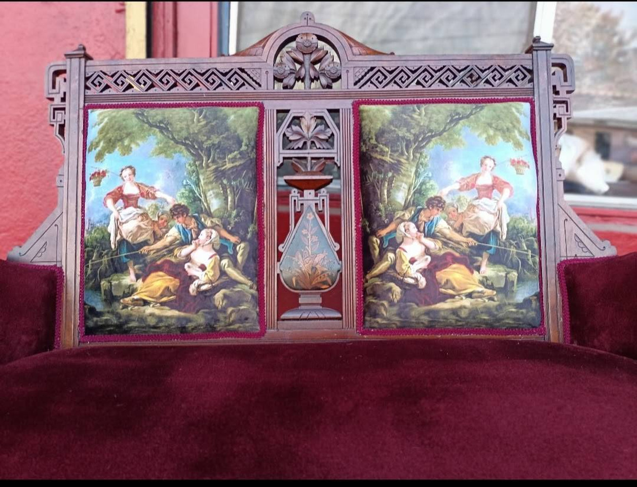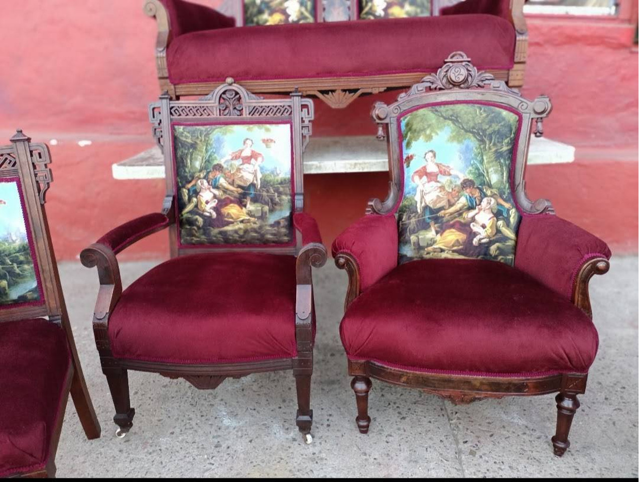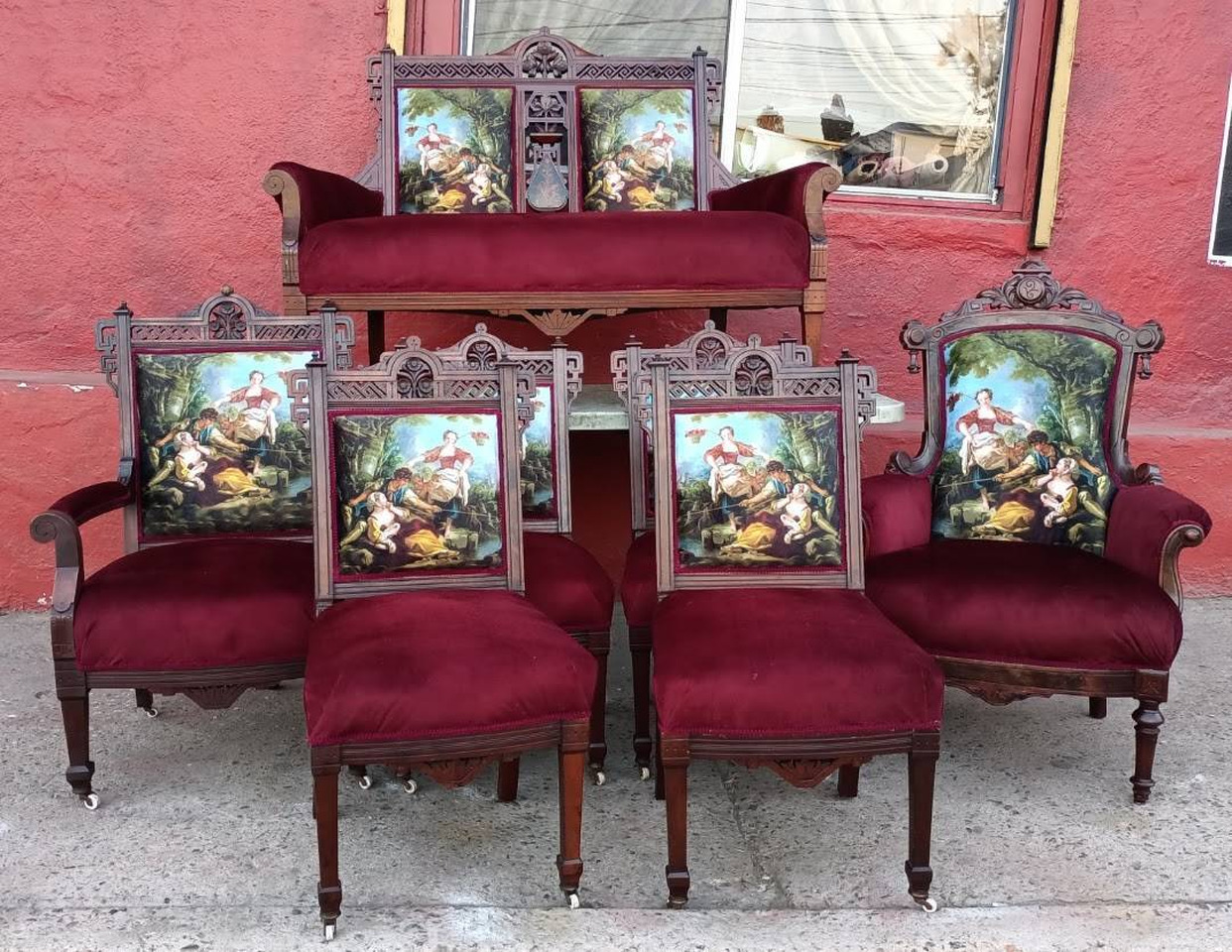 19th Century walnut victorian Eastlake parlor set 10 pc total 1 settee 2 arm chairs 6 armless chairs & 1 table all with new upholstery in velvet all in excellent condition.