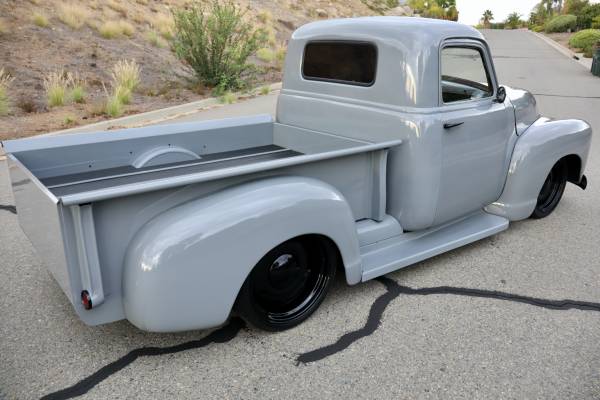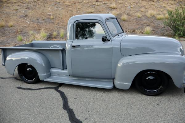 1949 Chevrolet 3100 Restomod. This 3100 comes with a 5.3 LS engine and a 4L60 Automatic transmission. Equipped with power steering and power brakes. This vehicle runs and drives great. Brakes have been upgraded to a Wilwood master cylinder and Wilwood four wheel disc brakes. Aluminum radiator with electric cooling fan. Exhaust has headers and Thrush mufflers. Body is sitting on a S10 chassis. 18 inch smoothie wheels in the front and 20 inch rims in the rear. Exterior is Grey with black and interior is black.