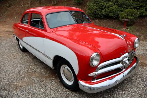 1949 Ford Custom. This Ford comes with a flathead six cylinder engine and a manual three on the tree transmission. The engine turns freely, but the vehicle is not currently running. As far as we know the drivetrain is original to the vehicle. Equipped with manual brakes and steering. Drum brakes on the front and rear.