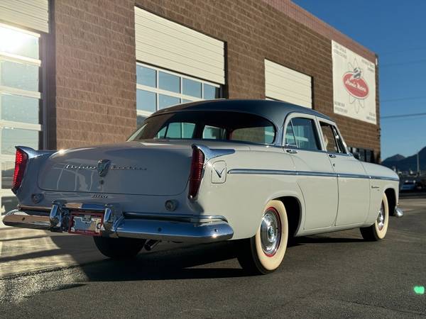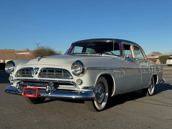 This 1955 Chrysler Windsor Deluxe four-door sedan has been refinished in gray with a darker gray roof over black patterned upholstery with red trim, and it is powered by a 301ci V8 paired with a two-speed automatic transmission.
