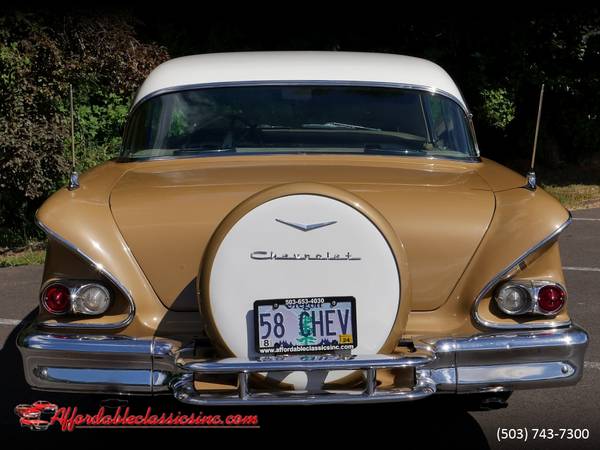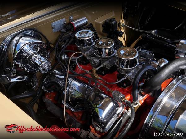 1958 Chevrolet Bel Air finished in Anniversary Gold with a White top and subtle ghost flames that show beautifully in the light. Powered by a 348 V8 with Tri-Power setup paired to an automatic transmission, it features an aluminum radiator, electric fan, and MSD ignition for improved reliability. Sitting on American Racing wheels, this Bel Air has great curb appeal with chrome and stainless trim in good condition throughout. The interior remains very original and well-preserved for its age, and the rear Continental kit adds a classic touch. A clean cruiser ready to enjoy.