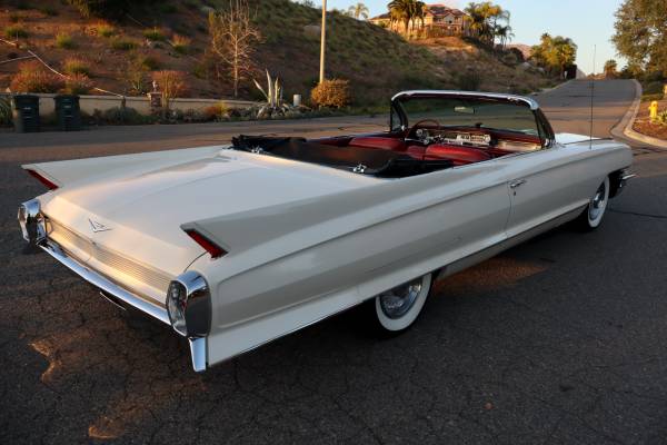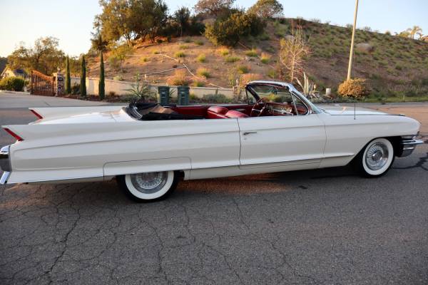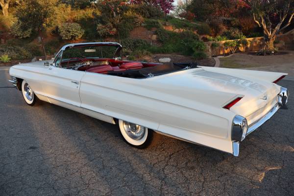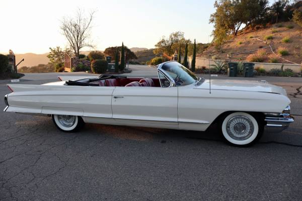 1962 Cadillac Series 62 Convertible. This vehicle comes with a 390 V8 engine and an automatic transmission. Equipped with power steering and power brakes. Drum brakes on the front and rear. This car runs and drives great. Still retains its original hubcaps and fender skirts. Wide white wall Diamondback Auburn series tires. Comes with the boot cover, spare tire and jack. White exterior, red interior and a black convertible top.