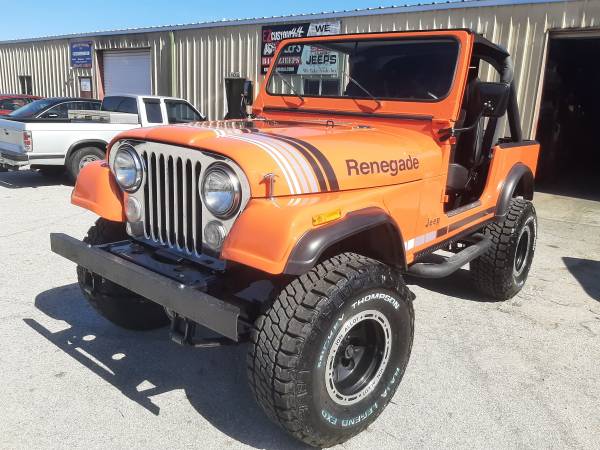 1984 Jeep CJ7 Straight 6 engine sounds like a V8 and Manual 5 speed transmission! Runs and drives great and this Jeep has new paint new tires, new retro decal kit and much much more! Cruise around in style in this gorgeous Orange with black trim Jeep CJ7 407-739-1699 or (844)-EZJEEPS!.... 321,689,9790. . . . BRING US YOUR TRADE IN - NATIONWIDE DELIVERY AVAILABLE TO YOUR DRIVEWAY! ..........If this one doesn't fit the bill, we have others and can build what you are looking for....................... .............WE WILL REFURBISH YOUR CLASSIC JEEP IF YOU HAVE ONE!!! .. EZCustom4x4.com..................