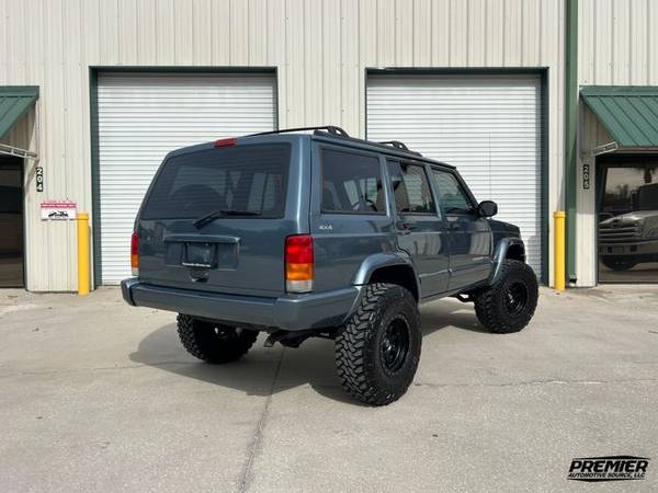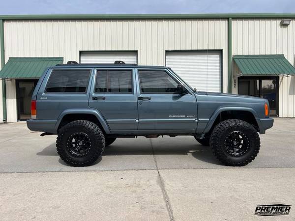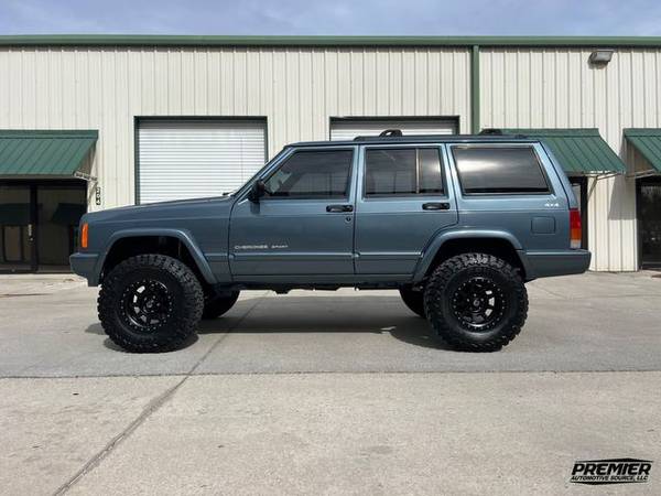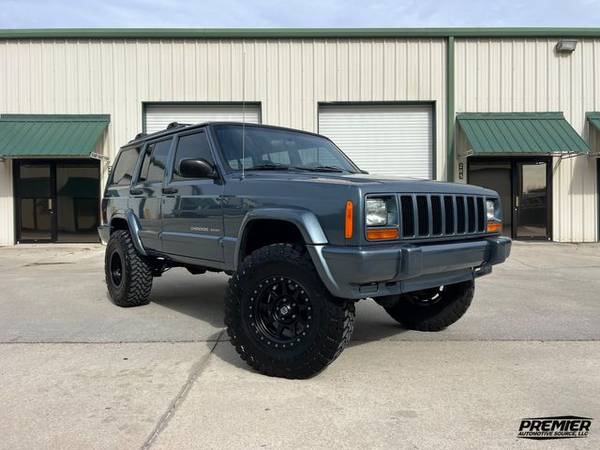 1999 XJ Jeep Cherokee sport 4WD, metallic blue with gray interior, and only 78,298 miles. 4.0 inline 6 engine, automatic transmission, factory A/C. Rough Country 3'' suspension lift and shocks, Mickey Thompson Deegan 38 aluminum wheels, 31x10.50x15 Toyo Open Country M/T tires, and tinted windows. This incredible low mileage XJ is very clean inside and out as well as underneath. Sold with 1 key, and floor mats.