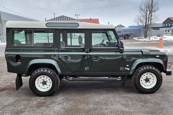Up for auction is this 2001 Land Rover Defender 110 TD5 5-speed, a left-hand-drive European-market example powered by a 2.5-liter turbodiesel inline-five paired with a five-speed manual transmission. Finished in Epsom Green with a white roof over gray cloth, highlights include recent import from Germany, fresh servicing, newly retrimmed front seats, white Wolf wheels, Michelin tires, LED lighting, and Quebec registration.