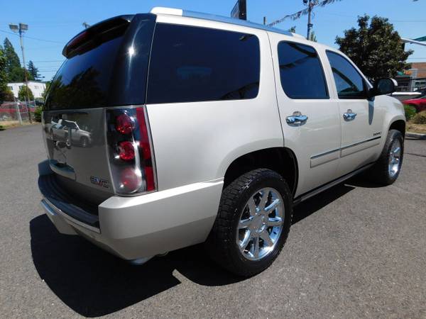 Seller Comments: The 2013 GMC Yukon AWD 4dr 1500 Denali is a luxurious and robust SUV that combines performance and elegance seamlessly.Featuring an exterior coated in the sophisticated Champagne Silver Metallic finish, it exudes a classic yet contemporary appearance that's sure to catch attention on the road. Beneath the hood lies a powerful 6.2L V8 engine, delivering impressive horsepower and torque, perfect for both city cruising and rugged terrains.The interior is adorned in a refined Cocoa/Light Cashmere color scheme, providing a warm and inviting cabin atmosphere. This Denali model includes premium features such as power-retractable assist steps, enhancing accessibility and style.The power tilt-sliding sunroof invites the sky into your drive, enhancing the overall driving experience. For those who love the open road, the integrated trailer brake controller makes towing with all-wheel drive both safe and efficient.Furthermore, the vehicle is equipped with an advanced audio system that includes navigation, ensuring an entertaining and hassle-free journey, wherever the destination. CALL OR TEXT 503-213-4101 We are a CUDL Dealer! (Credit Union Direct Lending) We are so proud to be one of the few used car dealers who received the 2022, 2023, 2024 Reputations 800 Award which is given to dealerships who achieve a reputation score of over 800. We wanted to set ourselves apart from every other used car dealer by honoring a commitment to full transparency.We are a CARFAX Advantage Dealer with links to full reports on our website.Of course all of our vehicles undergo a full inspection by our ASE Certified mechanics.You are more than welcome to have your own mechanic do an independent inspection.Our only objective is to provide you with 5 Star Service irrespective of whether or not you purchase a vehicle.