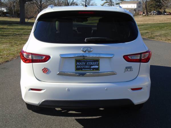 " BEST BUY " !!! This awesome 2013 Infiniti JX-35 AWD was a local nee car trade in, non-smoker, 1 owner and equipped with a "ton of options'' such as navigation system, memory seats, power liftgate, power heated leather seats, power windows. power locks, power heated mirrors, home-link, keyless entry, rear wiper, fog lights, DVD, AM/FM with CD changer, automatic headlights, parking assist rear, rear A/C, tilt wheel, cruise control, 3rd row seating, privacy glass, fold down rear seats, dual climate controls, blue-tooth, traction control, blind side mirrors, heated steering wheel, 2nd row heated seats, heated steering wheel, traction control, information center, ABS, back up camera, dual front and side airbags,' touring pkg", center console for storage and much more. Catch our reviews at Cars.com We offer safe, dependable, reliable and quality pre-owned vehicles.