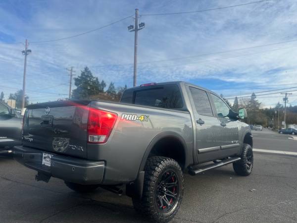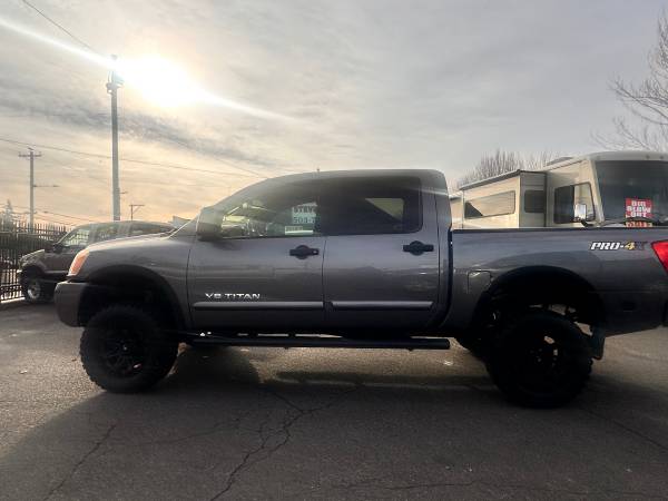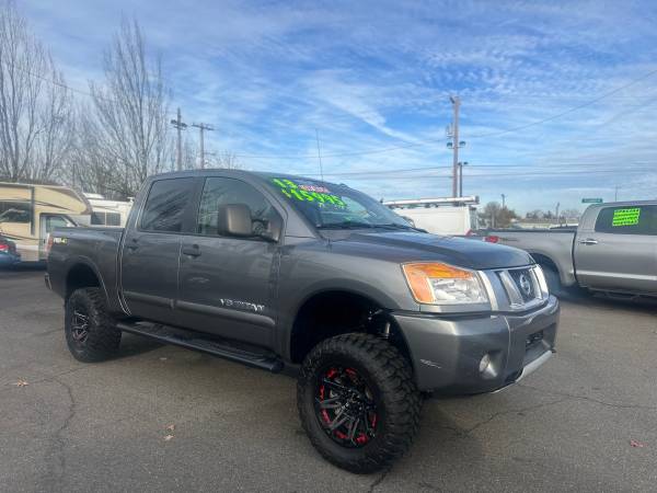 A bold, capable crew cab with a confident stance. This lifted 2013 Nissan Titan PRO-4X 4x4 Crew Cab is loaded for work and play, featuring a powerful V8, towing gear, modern tech, and rugged all-terrain rubber. DEQ emissions passed and ready to hit any terrain.