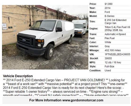 **🚐 2014 Ford E-250 Extended Cargo Van – PROJECT VAN GOLDMINE! 🚐** Looking for a **beast of a work van** with **massive potential** at a project price? This **one-owner** 2014 Ford E-250 Extended Cargo Van is ready for its next chapter! Here’s the scoop: - **Super reliable 1-owner history** – always serviced on time - **Engine runs strong** – smooth and powerful - **Current NJ safety inspection** – - **Huge extended cargo space** – perfect for deliveries, trades, camper conversion, or mobile business - **Clean PA title in hand** – no headaches - **Transmission issue**: No reverse (easy fix for the right person – think quick money-making flip!) This is the perfect **easy project van** for a mechanic, entrepreneur, or van-life builder who wants to turn a solid foundation into serious cash or the ultimate custom rig. **You can literally drive it home** (just plan your route – plenty of parking lots have pull-throughs 😏). Serious buyers only – come check it out in the Malvern PA area! **Don't sleep on this one** – these tough Econolines are getting harder to find! Message me now before it's gone! 💨