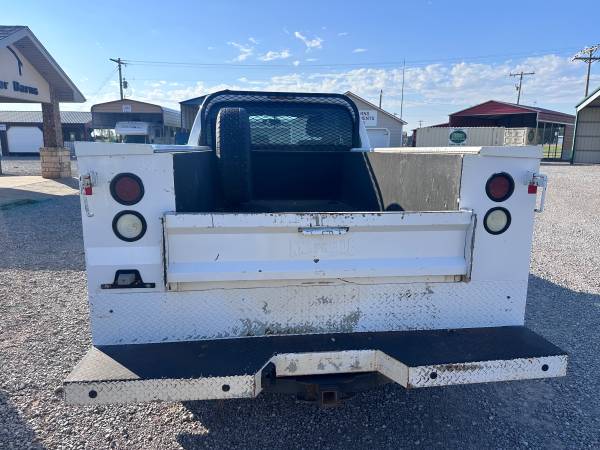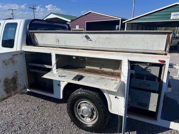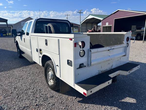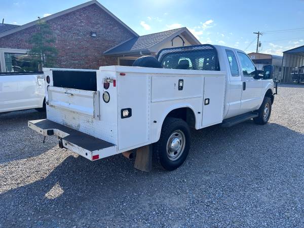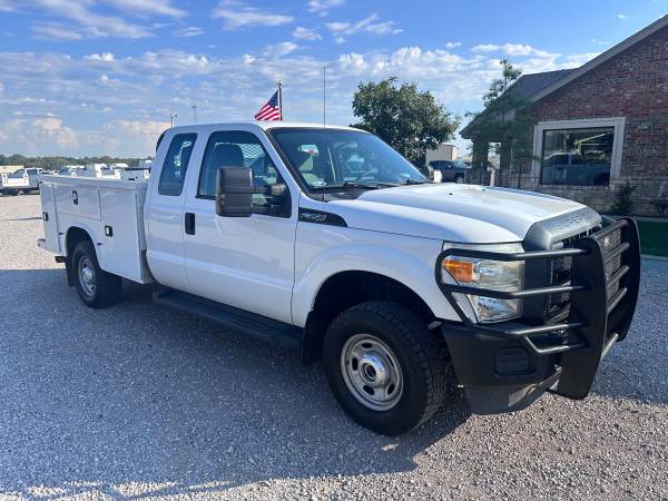 2015 FORD F350 EXTENDED CAB LONGBED SRW, 6.2L GAS V8 AND 4WD, XL PACKAGE WITH MANUAL WINDOWS AND LOCKS, CRUISE, AUX SWITCHES, TRAILER BRAKE CONTROL, HAS A RANCH HAND GRILL GUARD, KNAPHEIDE SERVICE BED WITH TOP BOXES, TIRES ARE 90%, RUN S GREAT, HAS 149K MILES