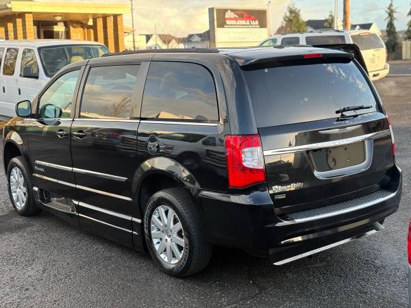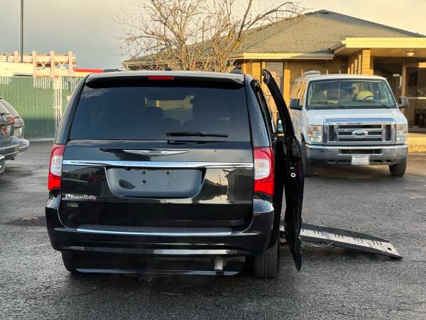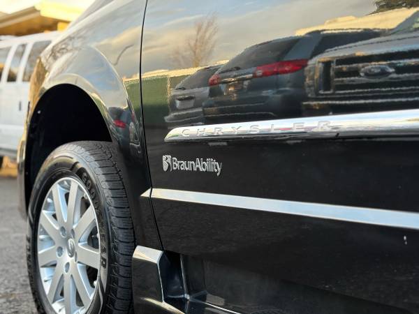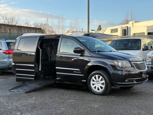 We are proud to present this 2016 Chrysler Town & Country Touring Wheelchair Accessible Van finished in Black on Black leather. This is a fully equipped side-entry mobility van with power ramp, power sliding door, and kneeling system — professionally built and originally customized for a wheelchair user to drive independently.