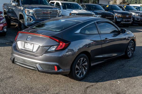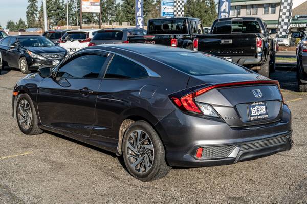The 2016 Honda Civic Coupe 2dr CVT LX is a modern marvel in the world of compact cars, boasting an appealing exterior finished in a sleek Modern Steel Metallic color. This hue is not just visually captivating but also offers a certain elegance and sophistication, making it a perfect choice for both urban and suburban landscapes. Its aerodynamic design is sportier and more dynamic, reflecting Honda's commitment to blending style with performance.Under the hood, this Civic Coupe is powered by a robust 2.0L 4-cylinder engine, promising a smooth and efficient driving experience. The Continuously Variable Transmission (CVT) further enhances fuel efficiency and provides seamless acceleration. Inside, the black/gray cloth seat trim complements the exterior, creating a cohesive and modern look that is as comfortable as it is stylish. The interior layout is cleverly designed, with intuitive controls and ample space, ensuring that both driver and passengers enjoy a comfortable ride. Advanced technological features are seamlessly integrated into the elegant dashboard, providing an enhanced user experience without sacrificing simplicity. Whether you're navigating through city streets or cruising on the highway, the 2016 Honda Civic Coupe 2dr CVT LX stands out with its combination of performance, style, and practicality.
