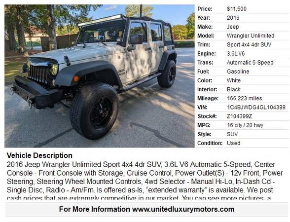 Is offered as-Is, “extended warranty” is available. We post cash prices that are extremely competitive in our market. You can see more pictures, a video, on our website @ www.unitedluxurymotors.com. We have different financing options available. We have prime lenders that can provide a single digit interest rate for people with good credit, but we also have secondary lenders that can work with any type of credit regardless of how challenging it is, with the RIGHT DOWN PAYMENT. JUST go to www.unitedluxurymotors.com hit “FINANCE” fill in the credit application and we will take care of the rest for you.