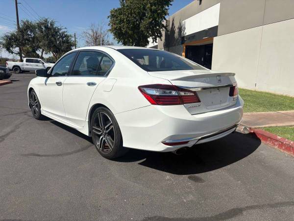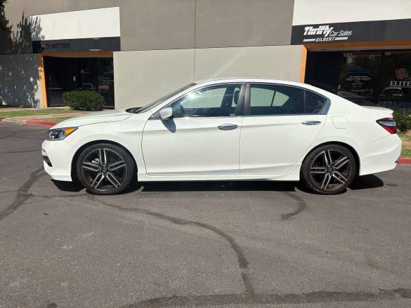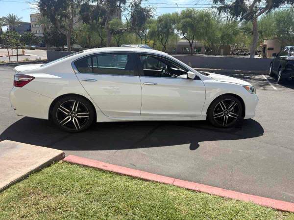 The 2017 Honda Accord Sedan Sport SE CVT exudes sophistication and performance, making it a standout in the midsize sedan category. With its striking white exterior, the Accord Sport SE not only commands attention but also ensures a crisp, clean aesthetic that complements its sleek, aerodynamic design. The athletic stance is enhanced by bold 19-inch alloy wheels and subtle yet distinct front and rear spoilers, adding to its sporty demeanor. Inside, the Accord Sport SE offers an inviting black leather interior that perfectly balances luxury and functionality. The seats are adorned with red stitching, providing a touch of sportiness that sets it apart from other trims. The cabin is spacious and thoughtfully designed, with user-friendly controls and high-quality materials throughout. The leather-wrapped steering wheel and gearshift knob further accentuate its premium appeal. Under the hood lies a robust 2.4L 4-cylinder engine paired with a CVT, which not only promises a smooth and responsive ride but also great fuel efficiency. The Accord Sport SE is equipped with paddle shifters, allowing for a more engaged driving experience. Safety features such as ABS, stability control, and multiple airbags come standard, ensuring peace of mind on every journey. This Accord model is the perfect blend of style, comfort, and performance, ideal for those who seek a dynamic driving experience without compromising on elegance.