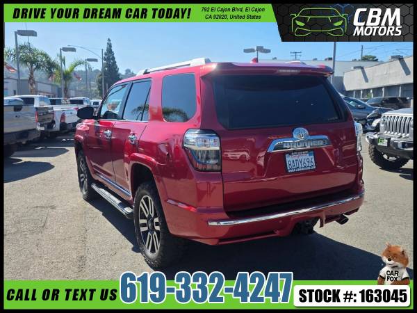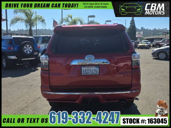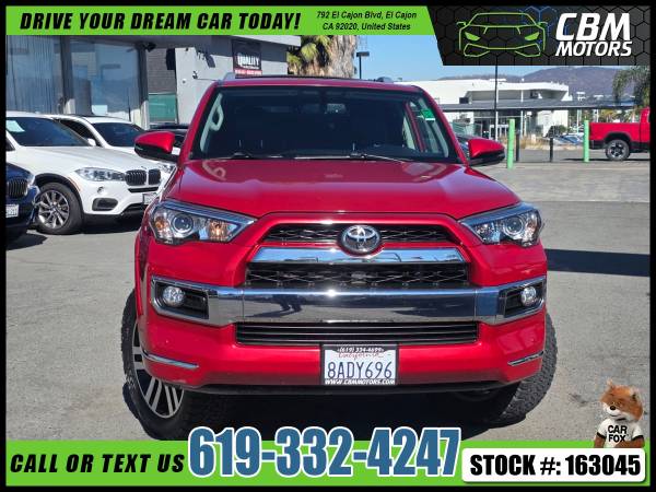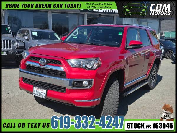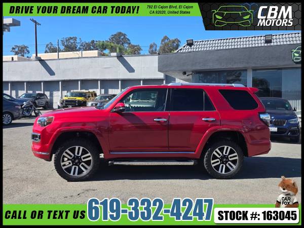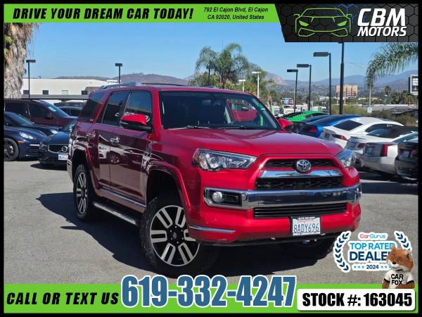 Reward yourself with the luxury and capability of our 2017 Toyota 4Runner Limited that's ruggedly handsome in Barcelona Red Metallic! Powered by a 4.0 Liter V6 that offers 270hp connected to a 5 Speed Automatic transmission for easy passing maneuvers. This Rear Wheel Drive SUV has impressive ground clearance and handles with precision and control while enjoying a smooth ride that scores nearly 20mpg on the road. Limited has been thoughtfully designed with your needs in mind. Admire the gorgeous alloy wheels and sunroof! The Limited cabin brings comfort and convenience to each day with heated/ventilated perforated leather-trimmed front seats, dual-zone climate control, HomeLink, pushbutton start, an auto-dimming rearview mirror, and a leather-wrapped steering wheel. Enjoy Entune Premium JBL Audio with integrated Navigation and App Suite featuring a high-resolution touchscreen and available HD/satellite radio. A 40/20/40 split seat offers versatility and reclines for additional comfort in the rear. Whatever your adventure, Toyota prepares you with ABS, a parking assist, a backup camera, airbags, and other advanced safety features. A phenomenal blend of utility, capability, and bold style, this 4Runner Limited is an ideal choice for your active lifestyle! Save this Page and Call for Availability. We Know You Will Enjoy Your CBM Motors Test Drive Towards Ownership! br>