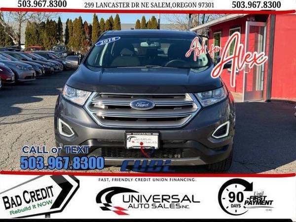 Welcome to Universal auto sales Next to Dicks Sporting Goods. Ask for Alex 5 ⃣0 ⃣3 ⃣-9 ⃣6 ⃣7 ⃣-8 ⃣3 ⃣0 ⃣0 ⃣ FINANCING AVAILABLE FOR ALL CREDIT SITUATIONS -WE PAY TOP DOLLAR TRADE INS! -WE ARE A CUDL DEALERSHIP AND HAVE FINANCING OPTIONS FOR ALL CREDIT TYPES! (CREDIT UNION DIRECT LENDING) -LOW FINANCING RATES! (OAC) -SERVICE CONTRACTS AVAILABLE! -CARFAX REPORTS AVAILABLE FOR EVERY VEHICLE! Hablamos Español: ITIN Aceptado Ask For Alex UNIVERSAL AUTO SALES INC 299 Lancaster Dr Ne Salem Oregon 97301 503.967.8300 DA2913 Introducing the sleek and powerful 2018 Ford Edge SEL. With its bold design and advanced technology, this SUV is the perfect combination of style and functionality. From its spacious interior to its impressive performance, the Edge SEL is ready to take on any adventure.