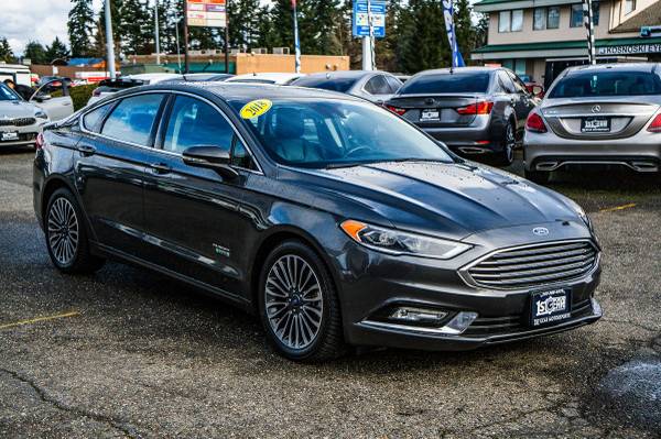 The 2018 Ford Fusion Energi Titanium FWD is a sophisticated blend of style and technology, designed for those who demand both performance and luxury in their vehicle. Cloaked in the striking Magnetic exterior color, this Fusion exudes a modern and sleek presence on the road. The harmonious contrast with the plush Ebony interior adds an air of elegance and refinement, making every drive an indulgent experience. At the heart of this vehicle lies a robust 2.0L 4-cylinder engine, providing a seamless blend of power and efficiency.Equipped with the Fusion Titanium Energi Driver Assist Package, this model takes driver convenience and safety to new heights. The adaptive cruise control with stop & go feature ensures a smooth, stress-free driving experience even in stop-and-go traffic. With the addition of the power moonroof, passengers can enjoy an open-air feel and take in panoramic views, enhancing every journey. The striking 18'' Magnetic machine-faced aluminum wheels further elevate the vehicle's exterior appeal, making a bold yet refined statement.Inside, the voice-activated touchscreen navigation system serves as the centerpiece of the Fusion's advanced technological offerings. This system offers effortless control and navigation, ensuring you stay connected and on course wherever the road leads. The overall design and features of the 2018 Ford Fusion Energi Titanium FWD demonstrate Ford’s commitment to innovation, style, and customer satisfaction. With its compelling combination of dynamic performance, advanced technology, and luxurious touches, this sedan is the epitome of modern automotive engineering.