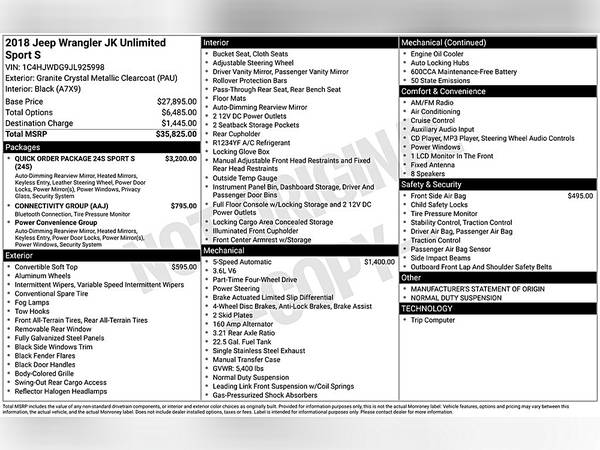 Granite Crystal Metallic Clearcoat 2018 Jeep Wrangler JK Unlimited Sport 4WD 5-Speed Automatic 3.6L V6 24V VVT