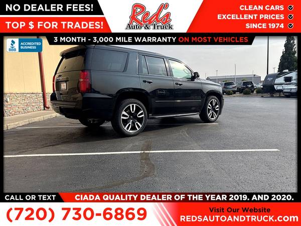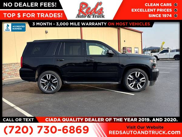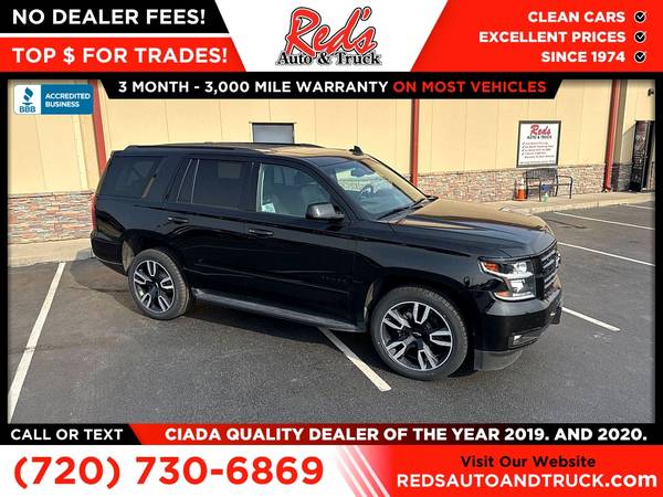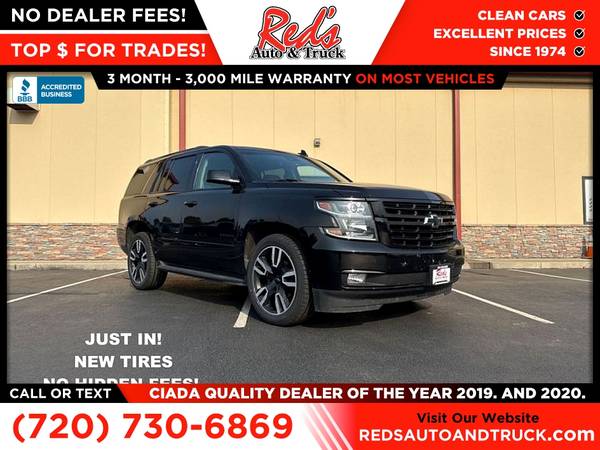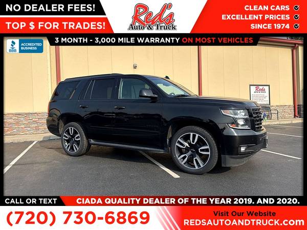 Red's Auto And Truck is pleased to present this 2-Owner 2019 Tahoe Premier 4x4 with just under 100,000 miles with fresh inspection and service in our shop with over $3,000 invested so you can buy with confidence! This 19 Tahoe Premier features a 2-owner accident-free CARFAX history report and was sold new here in Colorado. This Tahoe just received 4 new tires, new Mag ride Front Strut, new filters, wiper blades and more. Original MSRP on this loaded Tahoe 4x4 was $76,635 and is loaded with the RST package, 6.2 engine (not part of the current recall) rear entertainment package, heated and ventilated seats, navigation, blind spot and so much more! Remember, we also never charge a dealer handling or doc fee, include a limited warranty on most vehicles, and offer great protection plans at an affordable price to help protect your purchase for years to come. Please call Reds Auto and Truck at 303-726-5520. We are a proud member of CUDL and have access to many Credit unions at great rates. We are an A+ Rated Business with the BBB, Winners of the 2019 & 2020 CIADA Quality Dealer Of The Year Award, and have excellent online reviews. We have been in business since 1974. Meet us and see why. We offer clear, low upfront prices and also have no hidden dealer handling or documentation fees! Our vehicles undergo a multi-point inspection and reconditioning process, and most vehicles come with a 3-month 3,000-mile limited warranty. You can always see more photos and other cars at www.redsautoandtruck.com (http://www.redsautoandtruck.com/) or stop by 1451 Vista View Drive, Longmont, CO 80504.
