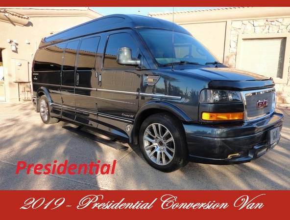 2019- Nine Passenger Extended GMC Savanna 2500- Hi Top Custom Explorer Limited Se Conversion Van, with the best upgrade packag, Amura Presidential, LOADED -Summary: This Van is Top of the Line , all Power Option, Six Captain Seats, Front two seats are Heated & Lumbar 8-way Power Seats, second row has two swivel seats that turns facing backwards if you wish and they’re easily removable if you want more open space , 3rd row has two additional easily removable seats, 4th row has a 3 Passenger Power Rear Seat/Bed - with a flip of a switch change the rear seat to a large 3 piece bed, also equipped with Front and Rear Cabin Air Conditioning with seperate controls, leather Rapped Sport Steering wheel - Equipped with Command Control Buttons for Cruise Control and Stereo, keyless Entry, Auto Start System, Power Steering-Brakes-Windows-Locks, Power Driver & Passenger Mirror , Adjustable Steering Tilt-Wheel, Cruise Control, Equipped with best electronics available