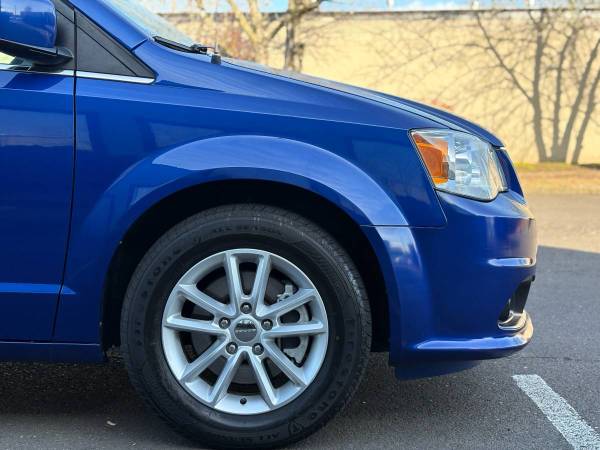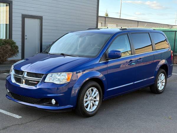 This 2019 Dodge Grand Caravan SXT rear-entry wheelchair van is a beautiful example finished in a sharp blue exterior with black leather interior. It is equipped with a full-length rear loading wheelchair conversion, one of the most practical and versatile setups available.