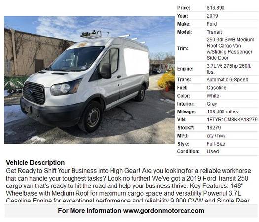 Get Ready to Shift Your Business into High Gear! Are you looking for a reliable workhorse that can handle your toughest tasks? Look no further! We've got a 2019 Ford Transit 250 cargo van that's ready to hit the road and help your business thrive. Key Features: 148" Wheelbase with Medium Roof for maximum cargo space and versatility Powerful 3.7L Gasoline Engine for exceptional performance and reliability 9,000 GVW and Single Rear Wheels for easy maneuverability One Owner, Always Serviced On Time - a true testament to its exceptional condition! Low Mileage: Only 108,000 miles - plenty of life left in this van! This van has been meticulously maintained and is ready for its next adventure. Don't miss out on this incredible opportunity to own a top-quality vehicle that will take your business to the next level. Come and check it out today! See for yourself why the Ford Transit is a favorite among business owners and entrepreneurs. Contact us to schedule a test drive and make this reliable van yours!