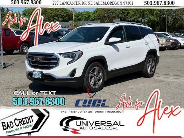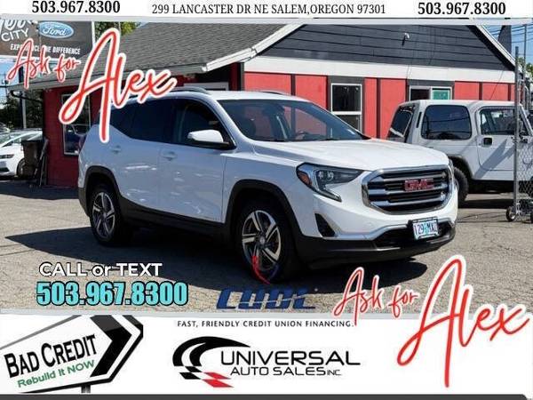 Welcome to Universal auto sales Next to Dicks Sporting Goods. Ask for Alex 5 ⃣0 ⃣3 ⃣-9 ⃣6 ⃣7 ⃣-8 ⃣3 ⃣0 ⃣0 ⃣ FINANCING AVAILABLE FOR ALL CREDIT SITUATIONS -WE PAY TOP DOLLAR TRADE INS! -WE ARE A CUDL DEALERSHIP AND HAVE FINANCING OPTIONS FOR ALL CREDIT TYPES! (CREDIT UNION DIRECT LENDING) -LOW FINANCING RATES! (OAC) -SERVICE CONTRACTS AVAILABLE! -CARFAX REPORTS AVAILABLE FOR EVERY VEHICLE! Hablamos Español: ITIN Aceptado Ask For Alex UNIVERSAL AUTO SALES INC 299 Lancaster Dr Ne Salem Oregon 97301 503.967.8300 DA2913 Introducing the luxurious and powerful 2019 GMC Terrain SLT! This stunning SUV is designed to elevate your driving experience with its sleek and modern design. With its spacious interior and advanced technology features, every journey will be comfortable and convenient. Equipped with a 1.5L turbo engine, the Terrain SLT offers impressive performance and fuel efficiency. The exterior boasts a bold grille, LED headlights, and chrome accents, making a statement on the road. Step inside and experience the premium leather-appointed seats, heated and ventilated front seats, and panoramic sunroof. The advanced infotainment system includes Apple CarPlay and Android Auto, allowing you to stay connected wherever you go. Safety is a top priority with features like lane keep assist, forward collision alert, and rear cross traffic alert. Don't miss out on the opportunity to own this exceptional 2019 GMC Terrain SLT. Visit our showroom today and take it for a test drive. You won't be disappointed!