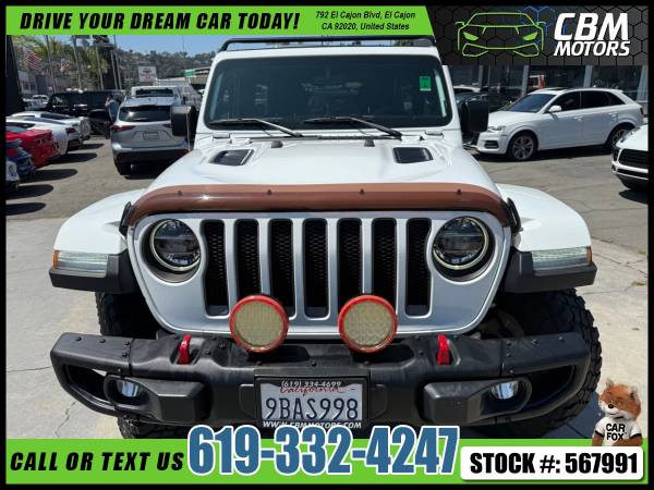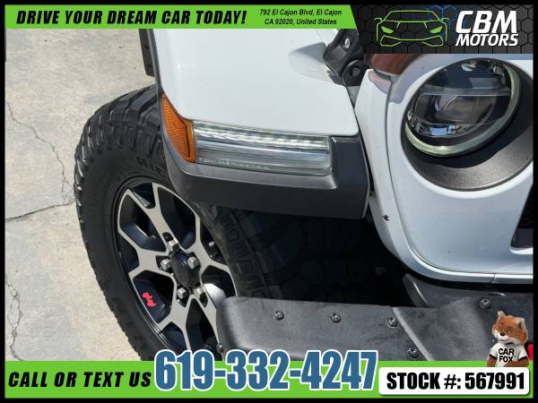 Our 2019 Jeep Wrangler Unlimited Rubicon 4 Door 4X4 brought to you in Bright White offers maximum fun! Powered by a 3.6 Liter Pentastar V6 that produces 285hp tethered to a robust 8 Speed Automatic transmission for amazing capability on the road or off. This Four Wheel Drive SUV boasts a Rock-Trac transfer case, Tru-Lok differentials, and Dana axles for trail-rated performance, and it returns nearly 23mpg on the highway. Showcasing iconic design, our Wrangler commands any terrain with its signature seven-slot grille, fog lamps, sunroof, heavy-duty rock rails, and aggressive body styling that will make you stand out in front of the crowd! Imagine yourself in control of our Rubicon and try to suppress a smile! Enjoy the supportive premium-cloth heated front seats, a heated leather-wrapped steering wheel, dual-zone automatic climate control, and impressively convenient technology. A 7-inch touchscreen with full-color navigation, Android Auto, Apple CarPlay, and Bluetooth will keep you connected as the eight-speaker audio system keeps you rocking! Every Jeep is engineered tough, and this one adds a high-strength steel frame, a backup camera, hill-start assist, electronic roll mitigation, and much more to help you stay out of harm's way. Reward yourself with this tremendously capable Wrangler Rubicon today! Save this Page and Call for Availability. We Know You Will Enjoy Your CBM Motors Test Drive Towards Ownership! br>
