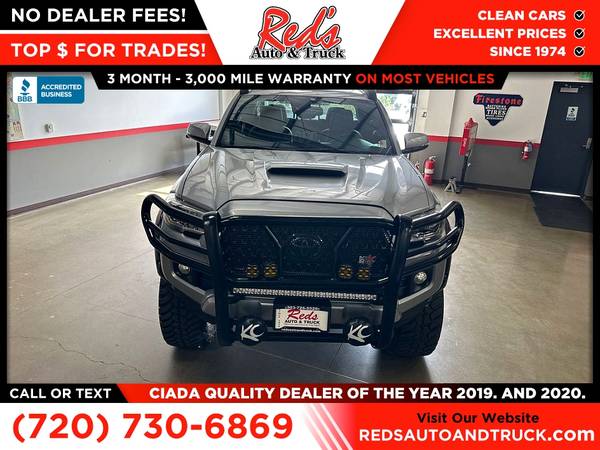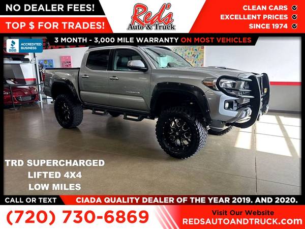 #TRD #supercharged Red's Auto And Truck is pleased to present this custom-built 2019 Toyota Tacoma TRD Sport 4X4. This Taco has been outfitted with $15,000 or so in goodies, starting with a Magnuson TVS 1900 Supercharger (Carb ID# D-4-88-59), boosting power to 370 horsepower and 330 pound-feet of torque while retaining smooth and reliable power. This Supercharger setup is $7,195 plus installation, bringing the total to around $10,000! The build also includes a lift kit with upgraded Mayhem wheels and 35x12.50x20 off-road tires. Inside, you will find a host of gauges to monitor all the fun, including boost, exhaust temp, differential temp, and trans temp. Upfront, you will find a heavy-duty push guard with a host of lights, including KC off-road lights and an LED light bar! To top it all off, you have underside-mounted train horns just because! This Tacoma has a fresh inspection, service, and Colorado emissions, so you are ready to roll! If you are looking for a sweet street and trail-ready TACO, this is it! Remember, we also never charge a dealer handling or doc fee, include a limited warranty on most vehicles, and offer great protection plans at an affordable price to help protect your purchase for years to come. Please call Reds Auto and Truck at 303-726-5520. We are a proud member of CUDL and have access to many Credit unions at great rates. We are an A+ Rated Business with the BBB, Winners of the 2019 & 2020 CIADA Quality Dealer Of The Year Award, and have excellent online reviews. We have been in business since 1974. Meet us and see why. We offer clear, low upfront prices and also have no hidden dealer handling or documentation fees! Our vehicles undergo a multi-point inspection and reconditioning process, and most vehicles come with a 3-month 3,000-mile limited warranty. You can always see more photos and other cars at www.redsautoandtruck.com (http://www.redsautoandtruck.com/) or stop by 1451 Vista View Drive, Longmont, CO 80504.