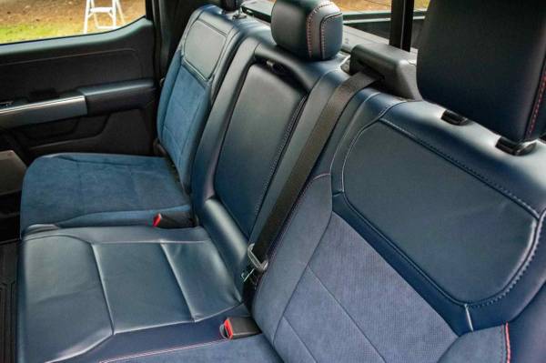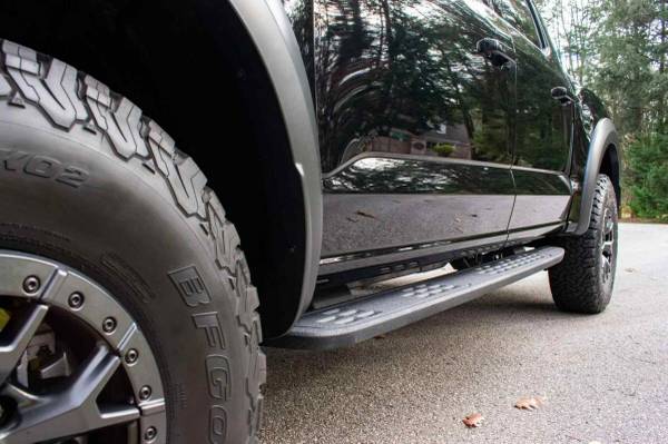 The Raptor features a wider track than the standard F-150 and is equipped with a model-specific bed, grille, bumpers, and running boards. Other details include automatic LED headlights, Rigid LED fog lights, a spray-in bedliner, BoxLink cargo management, and a Truxedo Pro X15 roll-up tonneau cover.