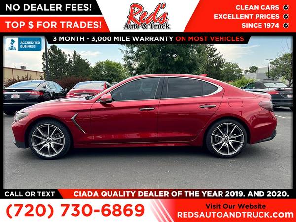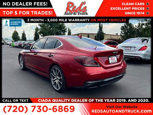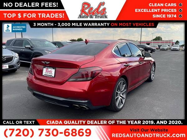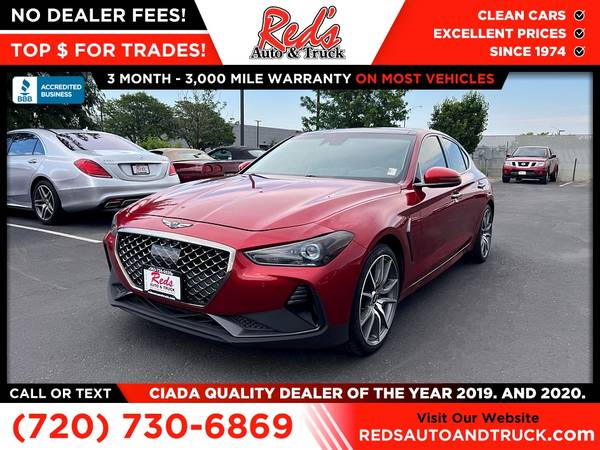 Red's is pleased to present this luxurious 2021 Genesis G70 AWD in stunning Havana Red. Combining sleek design, advanced technology, and premium features, this sedan offers an exceptional driving experience. It comes equipped with a 2.0L turbocharged 4-cylinder engine, 8-speed automatic transmission, and all-wheel drive. Recently serviced with a full inspection and fresh oil change, this vehicle is ready to hit the road. The vehicle features the highly desirable Elite Package, valued at $4,150, which includes an 8-inch touchscreen navigation system, parking distance warning, wide sunroof, power folding auto-dimming outside mirrors, power tilt-and-telescopic steering wheel, heated front seats (standard on AWD), Lexicon(R) 15-speaker surround sound audio system, leather seating surfaces, and aluminum interior trim. It also boasts the Prestige Package, worth $3,850, which offers a heads-up display, surround view monitor, low beam assist, wireless charging pad, 19-inch alloy wheels with summer tires (RWD) or all-season tires (AWD), Nappa leather seating with luxury quilting, power driver seat cushion extension, front passenger seat with 4-way power lumbar, heated rear seats, rain-sensing wipers, ventilated front seats, heated steering wheel, and a microfiber suede headliner. Remember, we also never charge a dealer handling or doc fee. We include a limited warranty on most vehicles and offer affordable protection plans to help safeguard your investment for years to come. This rare, fully loaded Genesis G70 AWD is an exceptional vehicle-schedule your test drive today and experience the luxury, technology, and performance firsthand! Please call Reds Auto and Truck at 303-726-5520. We are a proud member of CUDL and have access to many Credit unions at great rates. We are A+ Rated with the BBB, Winner of the 2019 & 2020 CIADA Quality Dealer Of The Year Award, have excellent online reviews, and have been in business since 1974 come see why. We offer clear low upfront prices and also have no dealer handling or documentation fees! Our vehicles undergo a multi-point inspection and reconditioning process and most vehicles come with a 3-month 3,000-mile limited warranty. You can always see more photos and other cars at www.redsautoandtruck.com (http://www.redsautoandtruck.com/) or stop by 1451 Vista View Drive Longmont CO 80504. Remember, we also never charge a dealer handling or doc fee, include a limited warranty on most vehicles, and offer great protection plans at an affordable price to help protect your purchase for years to come.