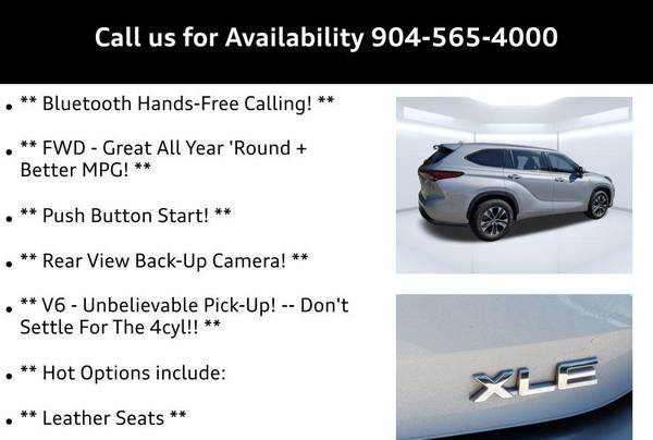 Priced below KBB Fair Purchase Price! Celestial Silver Metallic 8-Speed Automatic 3.5L V6 DOHC ** Bluetooth Hands-Free Calling! **, ** - Great All Year 'Round + Better MPG! **, ** Push Button Start! **, ** Rear View Back-Up Camera! **, ** V6 - Unbelievable Pick-Up! -- Don't Settle For The 4cyl!! **, ** Hot Options include:, ** Leather Seats **, ** Heated Seats **, ** Power Sunroof **, ** Power Liftgate **, ** Back Up Camera **, ** 3rd Row Seating **, Highlander XLE, 3.5L V6 DOHC, FWD, Celestial Silver Metallic, 18"" Machined Alloy Wheels, 21"" Alloy wheels, 3.003 Axle Ratio, 3rd row seats: split-bench, 4-Wheel Disc Brakes, 6 Speakers, ABS brakes, Air Conditioning, AM/FM radio: SiriusXM, Apple CarPlay/Android Auto, Auto High-beam Headlights, Auto-dimming Rear-View mirror, Automatic temperature control, Brake assist, Bumpers: body-color, Delay-off headlights, Driver door bin, Driver vanity mirror, Dual front impact airbags, Dual front side impact airbags, Electronic Stability Control, Emergency communication system: Safety Connect with 1-year trial, Exterior Parking Camera Rear, Four wheel independent suspension, Front anti-roll bar, Front Bucket Seats, Front Center Armrest, Front dual zone A/C, Front fog lights, Front reading lights, Fully automatic headlights, Garage door transmitter: HomeLink, Heated door mirrors, Heated Front Bucket Seats, Heated front seats, Illuminated entry, Knee airbag, Leather Shift Knob, Low tire pressure warning, Occupant sensing airbag, Outside temperature display, Overhead airbag, Overhead console, Panic alarm, Passenger door bin, Passenger vanity mirror, Power door mirrors, Power driver seat, Power Liftgate, Power moonroof, Power passenger seat, Power steering, Power windows, Radio: Audio Plus, Rear air conditioning, Rear anti-roll bar, Rear reading lights, Rear window defroster, Rear window wiper, Reclining 3rd row seat, Remote keyless entry, Roof rack: rails only, Security system, SofTex Seat Trim, Speed control, Speed-sensing steering, Split folding rear seat, Spoiler, Steering wheel mounted audio controls, Tachometer, Telescoping steering wheel, Tilt steering wheel, Traction control, Trip computer, Turn signal indicator mirrors, Variably intermittent wipers, Highlander XLE, 3.5L V6 DOHC, FWD, Celestial Silver Metallic.Recent Arrival! 21/29 City/Highway MPGAwards: * ALG Residual Value Awards, Residual Value Awards