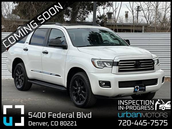 2021 Toyota Sequoia Nightshade Edition 4WD. 1 Owner. Apple CarPlay & Android Auto. Black Wheels. Blacked Out Trim and Emblems. Leather. Heated Seats. JBL Sound System. Sunroof/Moonroof. Touchscreen Navigation. Toyota Safety Sense: Adaptive Cruise Control, Lane Assist & Pre-Collision Warning. Blind Spot Monitoring. Back-Up Camera. Bluetooth. Parking Sensors. Power Liftgate. Push-Button Start. Running Boards. Steering Wheel Controls. USB/AUX Input. This vehicle has super minor Hail Damage. Passed Multi-Point Inspection. Service Plans (Warranty) Available. --NO DEALER FEES-- READ OUR GOOGLE REVIEWS. We are proud to support our troops and offer discounts for all Military Members & Local Heroes. Competitive Financing options available. Visit us at UrbanMotors.com, 5400 Federal Blvd, Denver, CO 80221, or TEXT/CALL (720) 445-7575