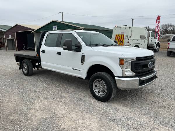 2022 FORD F250 CREW CAB LONGBED, 6.7L DIESEL AND 4WD, XL PACKAGE WITH POWER WINDOWS AND LOCKS, HAS VINYL SEATS AND FLOORS, CRUISE, BLUETOOTH, BACK UP CAMERA, REMOTE START, AUX SWITCHES, TRAILER BRAKE CONTROL, HAS A CM FLATBED WITH GOOSENECK BALL, TIRES ARE 90%, RUNS GREAT