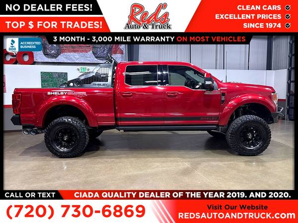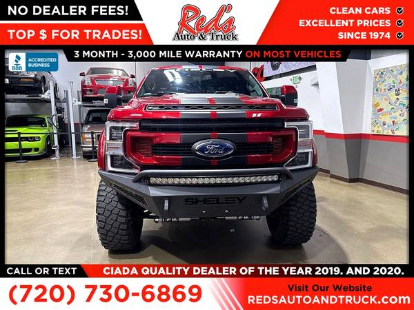 #SUPERBAJA #SHELBY #POWERSTROKE! Love your Ford Raptor but need a diesel, Ram TRX not beefy enough, DUramax AT4z still feels wimpy, here is your answer! Red's Auto And Truck is pleased to present this 2-owner Shelby Super Baja Diesel! Underneath the Super Baja are awesome parts that include a beefier steering stabilizer, custom radius arms up front, and a BDS lift kit. Shelby's front suspension uses heavy-duty coil springs with dual adjustable 2.5-inch Fox dampers to absorb rough terrain when things really get moving. To keep the rear axle's motions in check, Shelby fits the Baja with Fox 2.5-inch Fox external bypass dampers. Clawing into terra firma are 37-inch BFGoodrich Mud-Terrain KM3 tires mounted to 18-inch Shelby aluminum wheels. The lighting is extensive: 11.8-inch LED fog lights, a curved 40-inch front light bar, and a 50-inch power-actuated light bar mounted to the top of the rack. Remember, we also never charge a dealer handling or doc fee, include a limited warranty on most vehicles, and offer great protection plans at an affordable price to help protect your purchase for years to come. Please call Reds Auto and Truck at 303-726-5520. We are a proud member of CUDL and have access to many Credit unions at great rates. We are an A+ Rated Business with the BBB, Winners of the 2019 & 2020 CIADA Quality Dealer Of The Year Award, and have excellent online reviews. We have been in business since 1974. Meet us and see why. We offer clear, low upfront prices and also have no hidden dealer handling or documentation fees! Our vehicles undergo a multi-point inspection and reconditioning process, and most vehicles come with a 3-month 3,000-mile limited warranty. You can always see more photos and other cars at www.redsautoandtruck.com (http://www.redsautoandtruck.com/) or stop by 1451 Vista View Drive, Longmont, CO 80504.