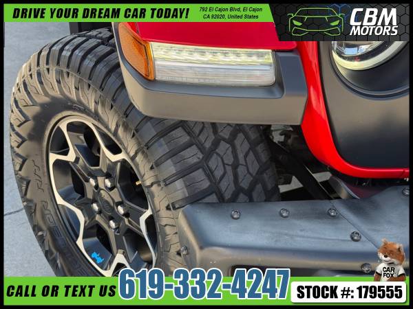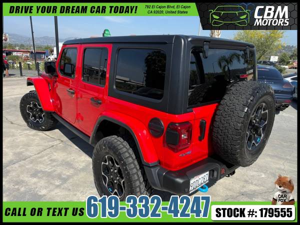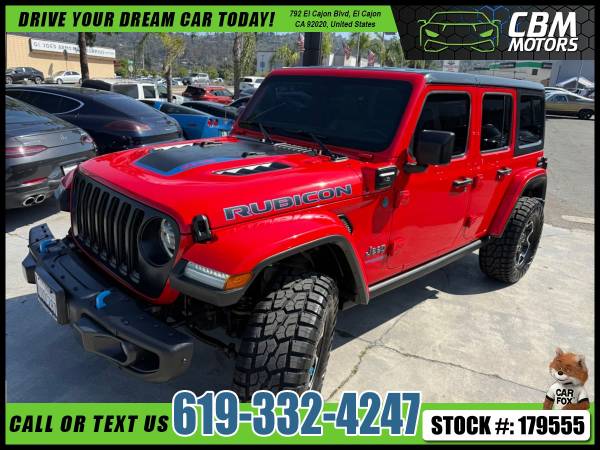 Our outstanding 2022 Jeep Wrangler 4xe Rubicon 4X4 takes a greener approach to Trail Rated performance in Firecracker Red! Powered by a TurboCharged 2.0 Liter 4 Cylinder and 2 Electric Motors supplying a combined 375hp to an 8 Speed Automatic transmission. This Four Wheel Drive SUV also rides with a Rock-Trac system and Dana axles so you can dominate where other SUVs fear to tread, and that's with plug-in capability for an EV driving range of nearly 22miles. Switch to gas-hybrid mode and go hundreds of more miles at 20mpg combined. Our Wrangler's rugged good looks get attention with LED lighting, hood vents, exclusive graphics, blue recovery hooks, alloy wheels, a sport bar, and a Sunrider soft top. Keeping comfortable is easy in our Rubicon cabin that pampers you with supportive heated leather seats, a leather-wrapped heated steering wheel, automatic temperature control, cruise control, 12V/115V power outlets, and keyless entry/ignition. Stay connected as you go with an 8.4-inch touchscreen, Off-Road Pages, full-color navigation, voice command, WiFi compatibility, Apple CarPlay/Android Auto, Bluetooth, and an Alpine sound system. Jeep safeguards your adventures with a backup camera, ABS, stability/traction control, hill-start assist, tire-pressure monitoring, advanced airbags, and more. Our Wrangler 4xe Rubicon is the plug-in hybrid with more possibilities! Save this Page and Call for Availability. We Know You Will Enjoy Your CBM Motors Test Drive Towards Ownership! br>