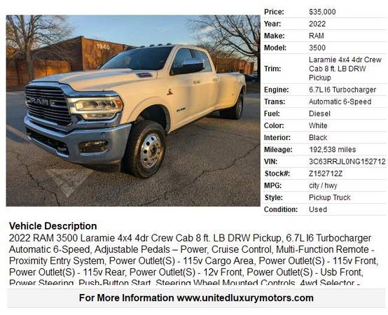 2022 RAM 3500 Laramie 4x4 4dr Crew Cab 8 ft. LB DRW Pickup, 6.7L I6 Turbocharger Automatic 6-Speed, Adjustable Pedals – Power, Cruise Control, Multi-Function Remote - Proximity Entry System, Power Outlet(S) - 115v Cargo Area, Power Outlet(S) - 115v Front, Power Outlet(S) - 115v Rear, Power Outlet(S) - 12v Front, Power Outlet(S) - Usb Front, Power Steering, Push-Button Start, Steering Wheel Mounted Controls, 4wd Selector - Electronic Hi-Lo, Trailer Brake Controller, Infotainment Screen Size - 8.4 In., Smartphone Integration - Wireless Android Auto, Smartphone Integration - Wireless Apple Carplay, Auxiliary Audio Input – Bluetooth, Auxiliary Audio Input – Usb, Radio - Am/Fm, Satellite Radio – Siriusxm, Camera System – Rearview.