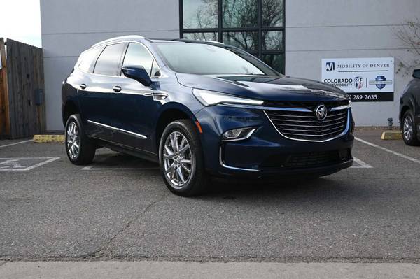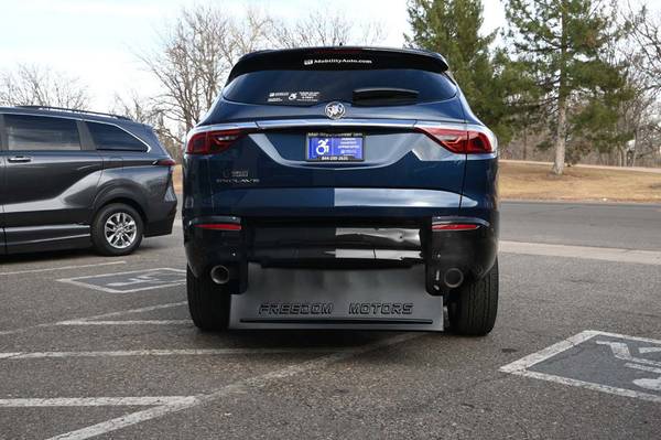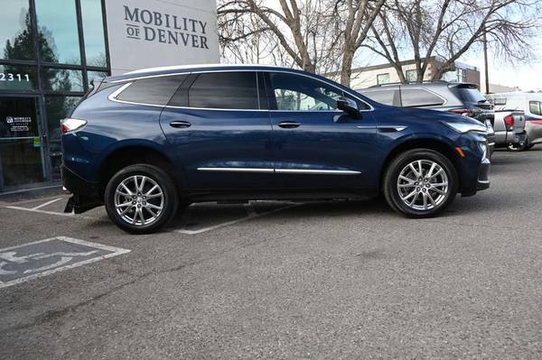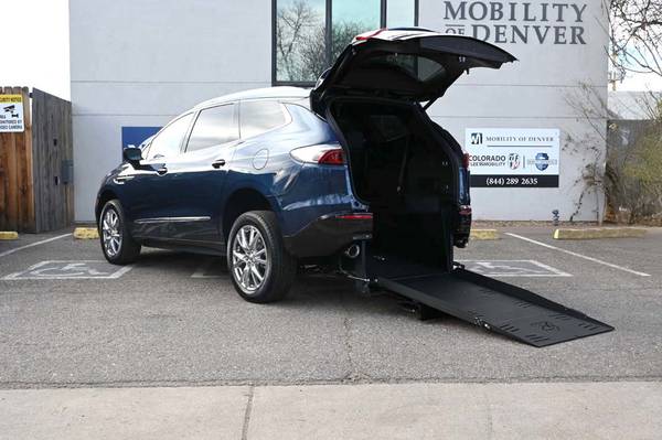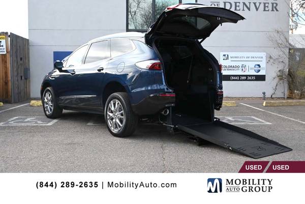 Door Opening Height: 54.5" and width: 34".?2023 Buick Enclave Essence FMI Long Cut Power Rear Entry wheelchair accessible SUV for sale. Used Freedom Motors Inc. conversion on a used Buick chassis with great SUV looks and ground clearance. This disability equipped handicap wheelchair accessible ramp van SUV is designed with the fit & finish of a luxury SUV and the roominess of an accessible rear-entry vehicle! 60 inch long channel and 34 inch wide power ramp with a long cut lowered floor. This accessible Buick SUV is in great overall condition and offers industry-high ground clearance of 8" at the rear tub. This great looking SUV comes packed with the manufacture's newest Safety driver-assistance features like Blind Spot Monitoring, Rear Cross Traffic Alert, Forward Collision Alert and Lane Keep, 360 degree backup camera, and includes: beautiful Blue exterior, gray leather interior, 20-inch Alloy Wheels, tires have 90% life left, steering wheel controls, 3-Zone Climate Control, LCD touch Display, 4G LTE with available built-in Wi-Fi hotspot for up to 7 devices, AM/FM/Satellite audio system with AUX port, USB port, power driver's seat, power windows, mirrors, and locks, keyless remote, cruise control, traction control, stability control, 4-wheel ABS system, smooth and efficient 3.6L 6-cylinder GM motor with front wheel drive, and much more. This vehicle is offered for sale by Mobility Auto Group. With two Colorado locations at: 1500 W Campus Drive, Littleton CO 80120 & 2311 S Platte River Drive, Denver CO 80223. We don't charge a Dealer Handling Fee and are your mobility one-stop-shop. Just give us a call as we offer it all: sales, service, parts, and rentals. Open M-F 9am - 6pm. Sat by appt. Call (844) 289-2635.