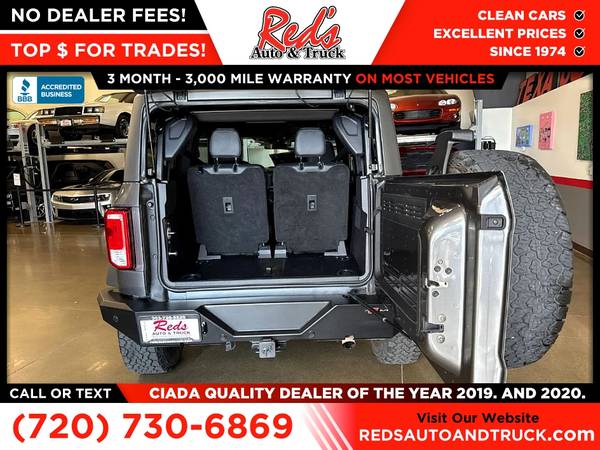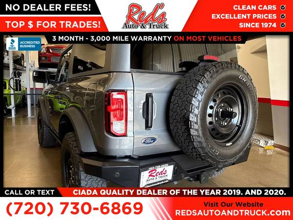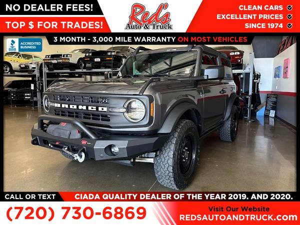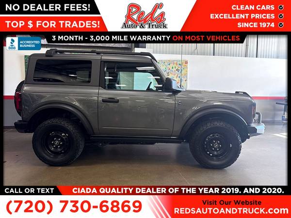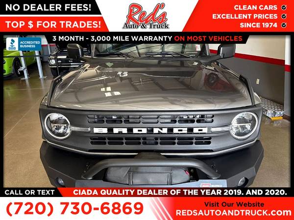 MANUAL TRANSMISSION, CHECK, HARD TOP, CHECK, WARN BUMPERS WITH WINCH,CHECK! Red's Auto And Truck is pleased to present this local 1-Owner 2023 Ford Bronco Black Diamond 2-Door Bronco. (we sold it to a client who just traded it back in after 2 months for something bigger so basically 1-owner) We just purchased this trail-ready Bronco from the original owner here in Longmont, Colorado. He was a car guy and took excellent care of this Bronco, and it shows. This is Bronco has the proper 3rd pedal, 2 doors, and a hard top! This Bronco also has Warn bumpers with a winch on the front! How you see this Bronco is how we bought it, he kept it that clean, this one didn't even need a rinse off before Photos. If you're looking for a clean Bronco 4X4 with a great history, this is it! Remember, we also never charge a dealer handling or doc fee, include a limited warranty on most vehicles, and offer great protection plans at an affordable price to help protect your purchase for years to come. Please call Reds Auto and Truck at 303-726-5520. We are a proud member of CUDL and have access to many Credit unions at great rates. We are an A+ Rated Business with the BBB, Winners of the 2019 & 2020 CIADA Quality Dealer Of The Year Award, and have excellent online reviews. We have been in business since 1974. Meet us and see why. We offer clear, low upfront prices and also have no hidden dealer handling or documentation fees! Our vehicles undergo a multi-point inspection and reconditioning process, and most vehicles come with a 3-month 3,000-mile limited warranty. You can always see more photos and other cars at www.redsautoandtruck.com (http://www.redsautoandtruck.com/) or stop by 1451 Vista View Drive, Longmont, CO 80504. Remember, we also never charge a dealer handling or doc fee, include a limited warranty on most vehicles, and offer great protection plans at an affordable price to help protect your purchase for years to come.