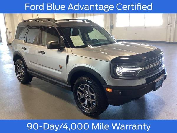 Certified. CARFAX One-Owner. Clean CARFAX. Bronco Sport Badlands, 4D Sport Utility, EcoBoost 2.0L I4 GTDi DOHC Turbocharged VCT, 8-Speed Automatic, 4WD, Iconic Silver Metallic, Ebony/Area 51 w/Unique Style Cloth Htd Sport Contour Bucket Seats, Class II Trailer Tow Package w/Trailer Sway Control, Equipment Group 400A. 4WD Priced below KBB Fair Purchase Price! Odometer is 5154 miles below market average! Iconic Silver Metallic