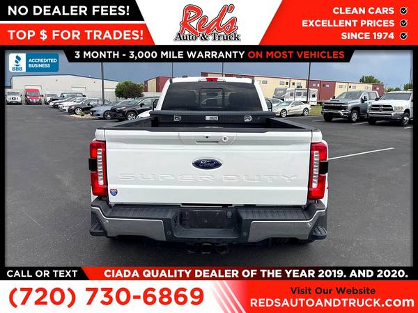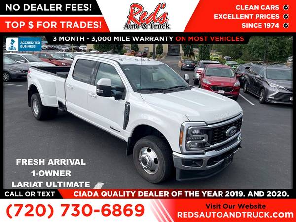 Red's Auto And Truck is pleased to present this local 1-Owner 2023 Ford F-350 Lariat Ultimate Dually with only 22,000 miles! We purchased this super clean truck from a repeat client who moved from a 5th wheel to a coach and no longer needed the truck. She ordered this truck new here in Colorado with ALL the right options like 4.10 rear axle, camper package, engine block heater, and the $5000 Lariat Ultimate Package with power running boards, tow technology, camera package and more! This truck is ready to tow with factory 5th wheel prep with hitch induced as well as a tool box for storage! Since this has the 4.10 axle this beast can 5th wheel tow 35,200 pounds!! If you want a nice truck with great ownership history this is it! Remember, we also never charge a dealer handling or doc fee, include a limited warranty on most vehicles, and offer great protection plans at an affordable price to help protect your purchase for years to come.