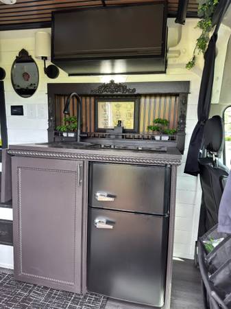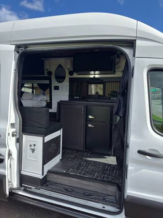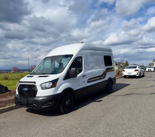 Turn-key camper van ready for travel or full-time vanlife. This 2023 Ford Transit AWD (F250) runs and drives perfectly and is a 1-owner vehicle. The van has been converted into a comfortable, modern tiny home on wheels with a clean black-and-white interior and smart use of space.