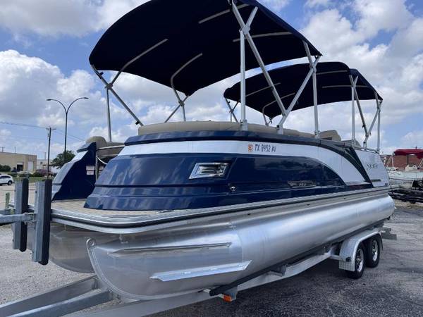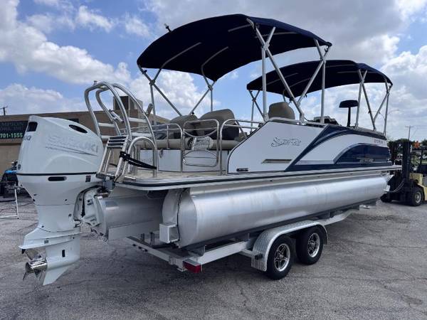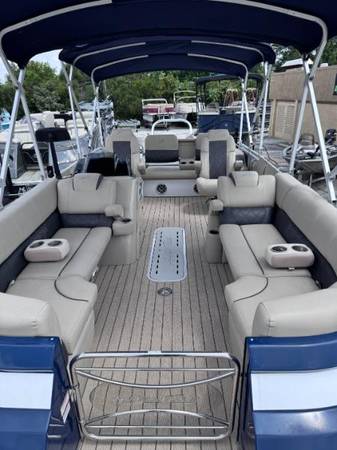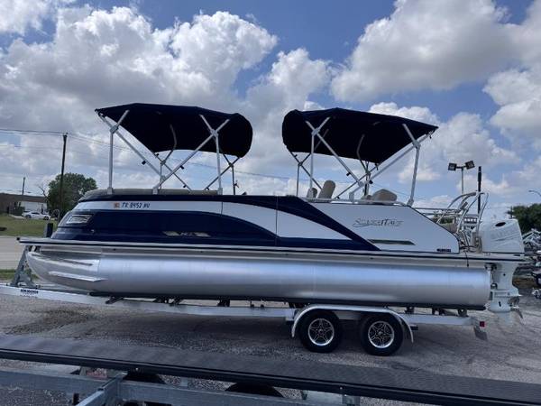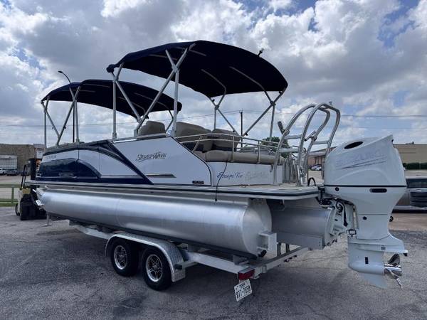 2023 SilverWave 2410 SW5 JS Tritoon boat with a Suzuki DF200hp 4 Stroke Outboard. Only (45) hours on this boat and motor. Electronic throttle. Double Bimini setup with boot covers. Reversible folding lounger with fold down armrest and cupholders. Dual Captain's chairs. Ski locker with automatic bilge pump. Garmin chartplotter/fishfinder. Wetsounds Bluetooth receiver and premium sound system. Stainless steel telescoping ladder and ski tower with built-in rod holders. Saltwater package but never been in salwater. LED courtesy lighting and lighted cupholders. Remote controlled RGB LED lighting. Hydraulic steering with tilt steering at the helm. Woven vinyl flooring. Two tone vinyl interior. Stainless steel folding cleats. Removable cupholders. Tandem axle aluminum trailer with custom alumium wheels and heavy duty tongue jack. Ready to be splashed into the lake. We have multiple pontoons in stock. Why buy new when you can save thousands on a preowned boat. Will buy back the trailer if not needed and deliver to your lake or marina of choice for no additional cost. More pontoons to choose from that aren't listed on our website yet. Call or come buy before it's gone. Appointments are encouraged and preferred. FYI, act fast because we are selling most of our newest arrivals prior to even getting listed on our website. No haggle no hassle bargain pricing! Need financing? We offer bank, credit union, and second chance financing. Go to www.championmotors.com to view pictures and apply for credit. For better service so you don't have to wait, please call to make an appointment. All internet prices offered, are subject to change or removed without notice unless a deposit is left to hold. Transportation assistance available.