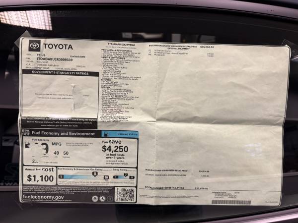 This stunning vehicle features a sleek Guardian Gray exterior paired with a sophisticated black leather interior. It’s equipped with a convenient touchless trunk open and close feature, making daily errands a breeze. Purchased new from Renton Toyota, this Prius has been serviced exclusively at the dealership since day one, ensuring it’s been maintained to the highest standards. The original window sticker is included for your reference. Step inside and you’ll be greeted by the unmistakable new car smell, and you’ll notice right away that the interior and exterior both look absolutely immaculate. If you’re looking for a reliable, stylish, and meticulously cared-for hybrid, this Prius is ready for its next owner. Please reach out if you’d like more information or want to schedule a test drive.