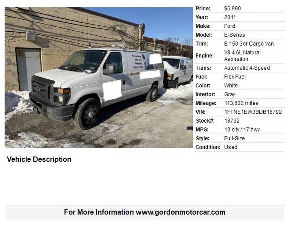 **For Sale: 2011 Ford E-150 Cargo Van – Low Miles, Work-Ready Beast!** Looking for a tough, reliable workhorse that won't break the bank? This 2011 Ford E-150 Cargo Van is ready to haul tools, materials, or whatever your job throws at it! - **Only 113,000 miles** – that's LOW for a 14-year-old commercial van. Plenty of life left in this one! - **Powerful and proven 4.6L V8 gasoline engine** – 225 horsepower, smooth automatic transmission, and legendary Ford reliability. This V8 is known for running strong for hundreds of thousands of miles with basic maintenance. - **Huge cargo space** – massive interior room (over 237 cubic feet) perfect for contractors, handymen, plumbers, electricians, or delivery pros. - **Custom shelving and ladder rack setup** – already equipped and organized for maximum efficiency. No need to spend extra customizing it yourself! - **Power windows and power door locks** – modern conveniences in a no-nonsense work van. - **Brand new Pennsylvania safety and emissions inspection** – passed with flying colors, good to go for another year. Clean and road-ready! This van has been well-maintained and is perfect for someone who needs dependable transportation without the high price tag of a newer model. Tough, spacious, and built to last – these Econoline vans are work legends for a reason! Serious buyers only. Located in Paoli, PA. Asking $6,990 – based on current market around $9k–$12k for similar low-mile examples. Call 610.640.7515 to schedule a test drive today! Don't miss out – vans like this don't last long! 🚐💪