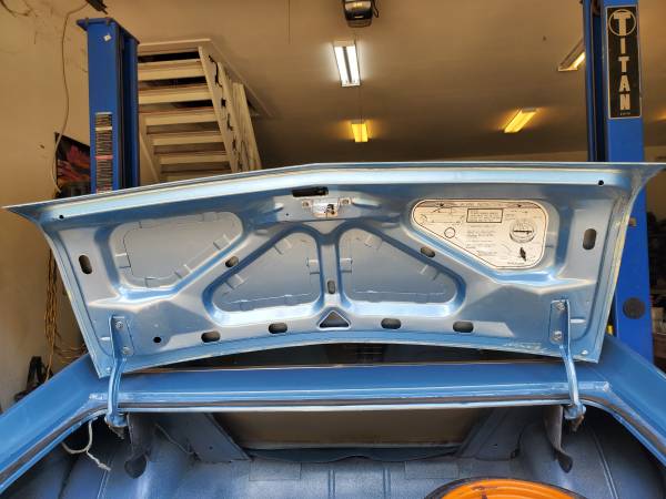 This car was very solid to start with and had very little rust to deal with bottom 4 inches of both rear quarters were patched just behind rear wheel where they all accumulate dirt. The car was mechanically stripped to bare metal, sprayed top to bottom with 2 coats of PPG epoxy primer to seal the metal then sprayed with a polyester blocking primer and blocked multiple times to get it lazer straight. We then sprayed the car in its original Bayshore Blue metallic with multiple coats of PPG base coat and multiple coats of clear. The whole car was then wet sanded and buffed to mirror shine. Entire underbody of car was thoroughly cleaned and sprayed with undercoating to seal it.