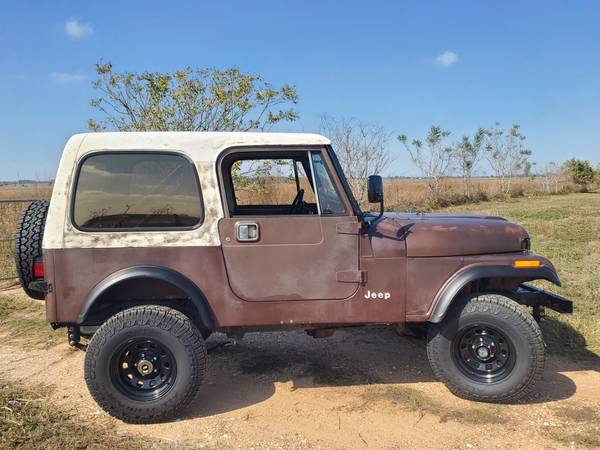 ** 1984 Jeep CJ7, original faded patina brown exterior, black interior, factory hard doors w white hardtop w remnants of partial camo, 6 cyl, T176 4 spd, ps & more.